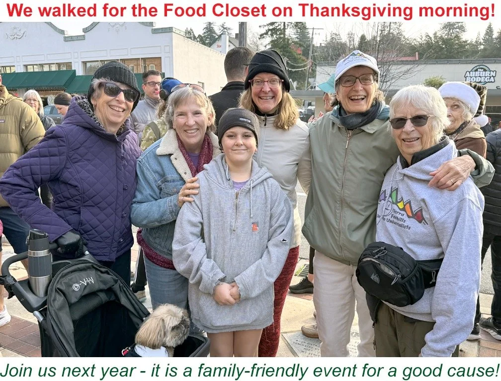 Members of SFUU gather with the larger community for a walk through town to raise money for the Auburn Interfaith Food Closet every Thanksgiving morning. It is usually a beautiful Fall day to walk joyfully with so many in support of the Food Closet. We meet up on Thanksgiving morning prior to the 9am start in the sunny spot by Tangos!